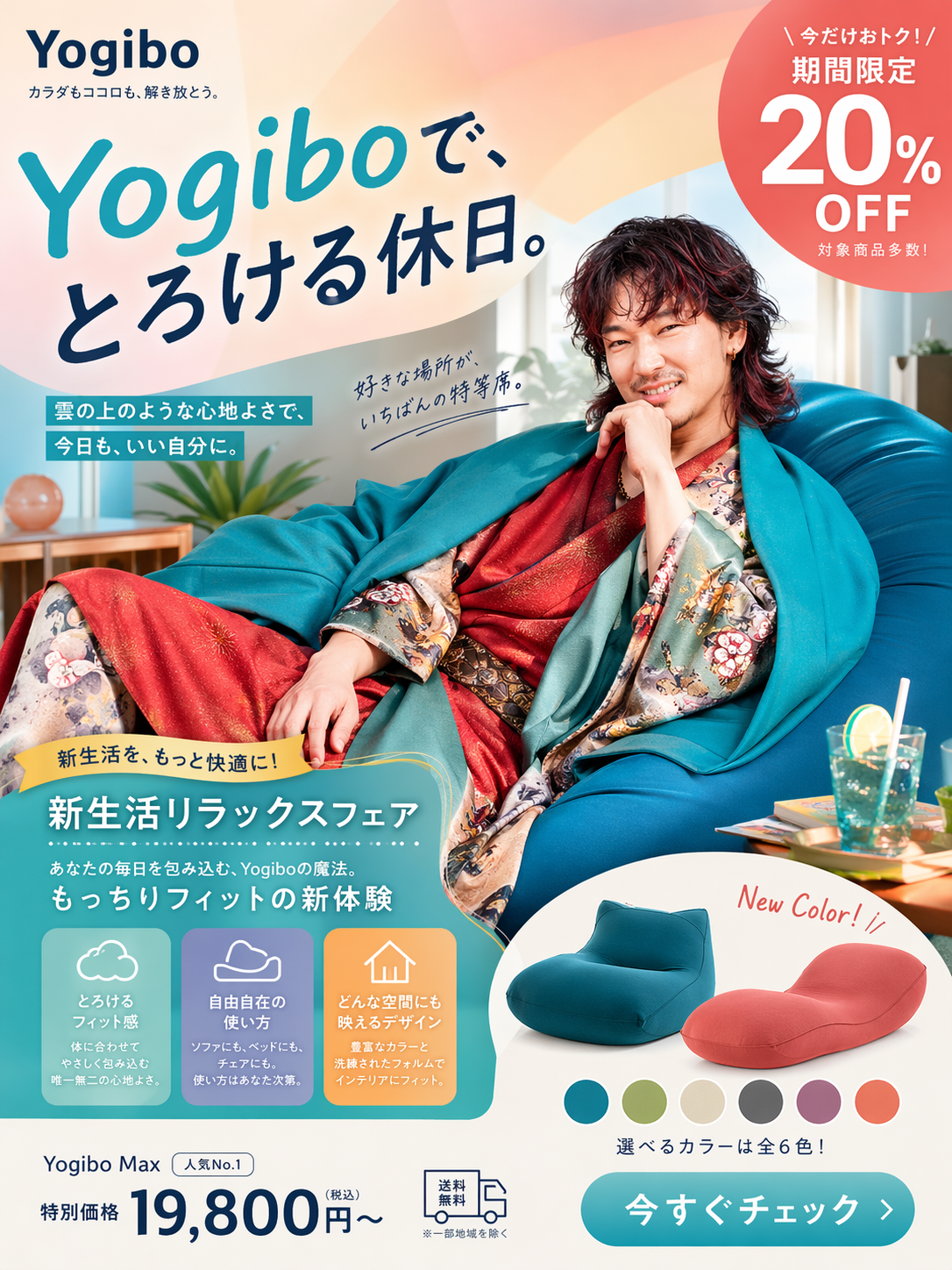 「このキャラを使って架空のyogiboのチラシを作成 アスペクト比=3:4」