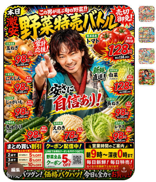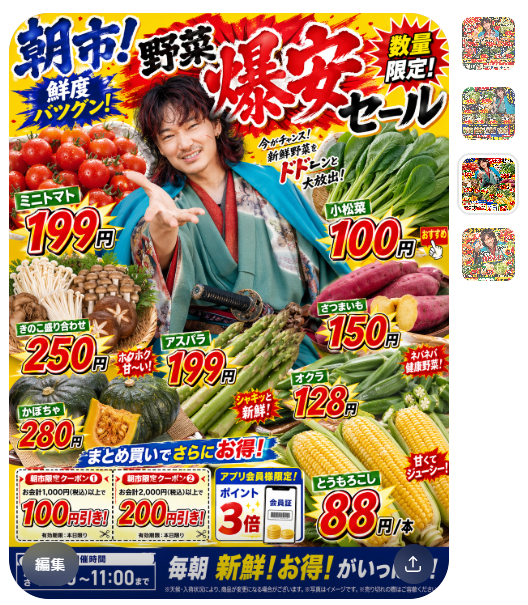 「このキャラで野菜の特売のチラシを作って。ドン・キホーテのチラシ風。アスペクト比=3:4。N=4」