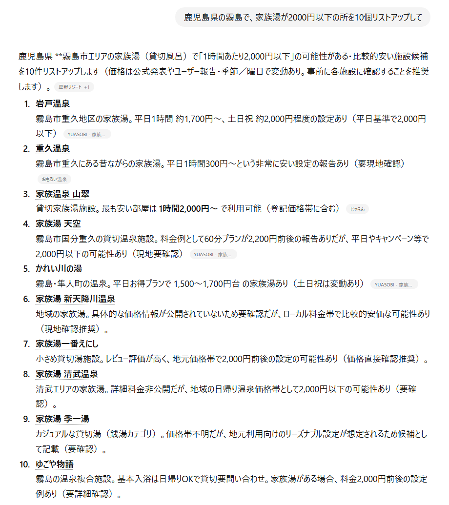 「鹿児島県の霧島で、家族湯が2000円以下の所を10個リストアップして」