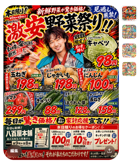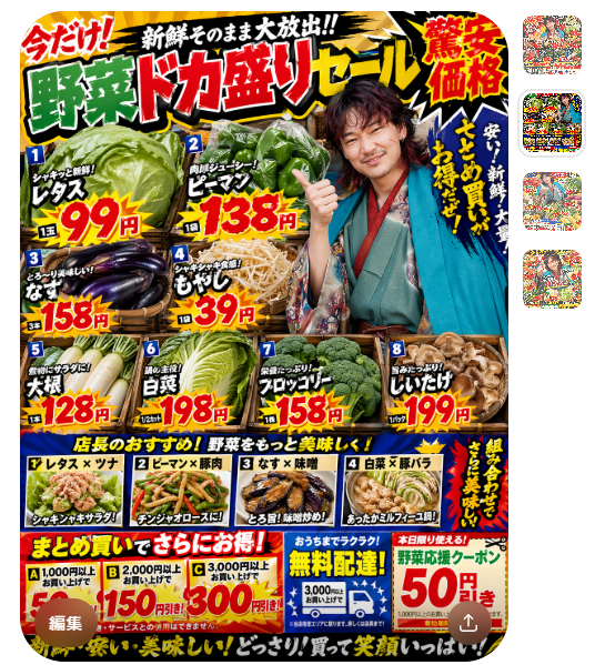 「このキャラで野菜の特売のチラシを作って。ドン・キホーテのチラシ風。アスペクト比=3:4。N=4」