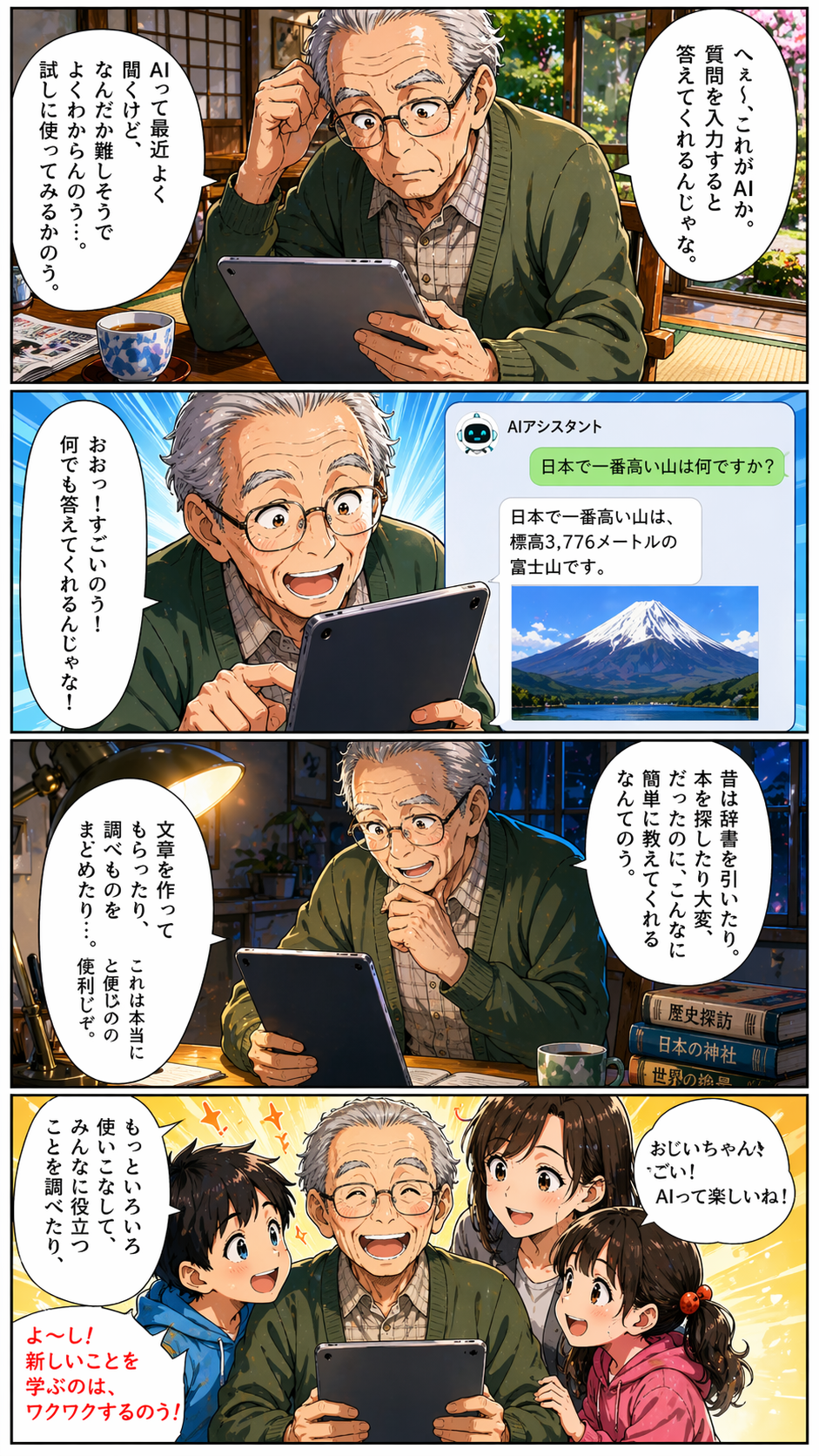 4つのコマ割りで構成し、キャラクターの感情が伝わるように描いてください。